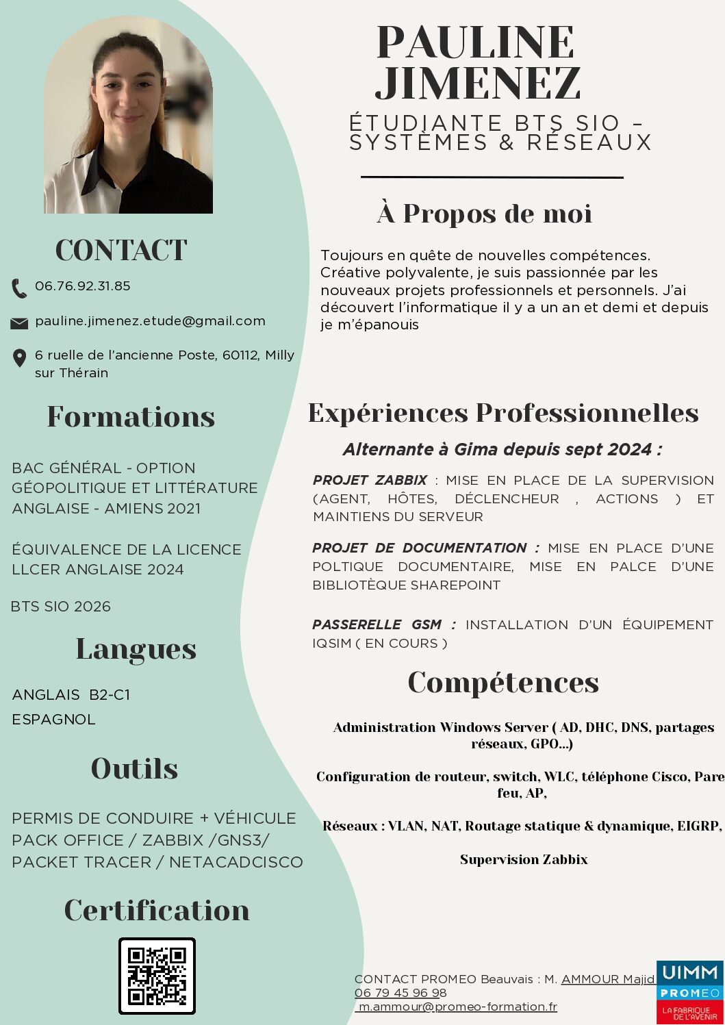 Sortie d’un BAC Géopolitique et littérature Anglaise, j’ai choisi ensuite de m’orienté vers une licence LLCER Anglaise puis à la fin de ma troisième année, j’ai décidé de m’orienté vers un BTS SIO option SISR pour développé mon coté scientifique et donné un sens à ma carrière professionnel.